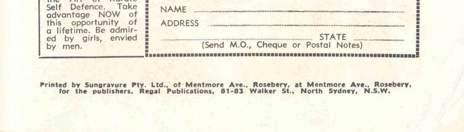Printed by Sungravure Pty. Ltd., of Mentmore Ave., Rosebery, at Mentmore Ave., Rosebery, for the publishers Regal Publications, 81-83 Walker St., North Sydney, N.S.W.