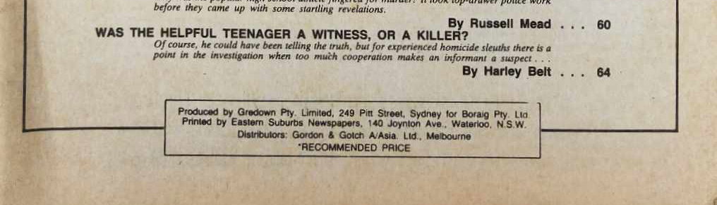 Produced by Gredown Pty. Limited, 249 Pitt Street, Sydney for Boraig Pty. Ltd. Printed by Eastern Suburbs Newspapers, 140 Joyhnton Ave., Waterloo, N.S.W. Distributors: Gordon & Gotch A/Asia. Ltd., Melbourne.