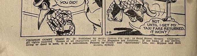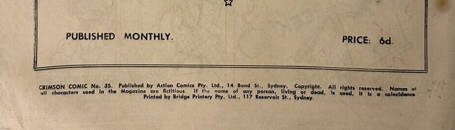 Crimson Comic [sic] No. 35. Published by Action Comics Pty. Ltd., 14 Bond St., Sydney. Copyright. All rights reserved. Names of all characters used in the magazine are fictitious. If the name of any person, living or dead, is used, it is a coincidence. Printed by Bridge Printery Pty. Ltd., 117 Reservoir St., Sydney.