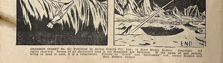 Crimson Comet No. 43: Published by Action Comics Pty. Ltd., 14 Bond Street, Sydney. Copyright. All rights reserved. Names of all characters used in the Magazine are fictitious. If the name of any person living or dead is used, it is a coincidence. Printed by "Truth" and "Sportsman" Ltd., corner Kippax and Holt Streets, Sydney.