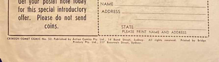 [Cover:] Crimson Comet Comic No. 53: Published by Action Comics Pty. Ltd., 14 Bond Street, Sydney. All rights reserved. Printed by Bridge Printery Pty. Ltd., 117 Reservoir Street, Sydney. [Interior:] Crimson Comet No. 53. Published by Action Comics Pty. Ltd., 14 Bond Street, Sydney. Copyright. All rights reserved. Names of all characters used in the Magazine are fictitious. If the name of any person, living or dead is used, it is a coincidence. Printed by "Truth" and "Sportsman" Ltd., corner Kippax and Holt Streets, Sydney.