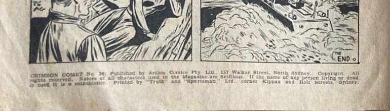 Crimson Comet No. 26: Published by Action Comics Pty. Ltd., 153 Walker Street, North Sydney. Copyright. All rights reserved. Names of all characters used in the magazine are fictitious. If the name of any perosn living or dead is used it is a coincidence. Printed by "Truth" and "Sportsman" Ltd., corner Kippax and Holt Streets, Sydney.