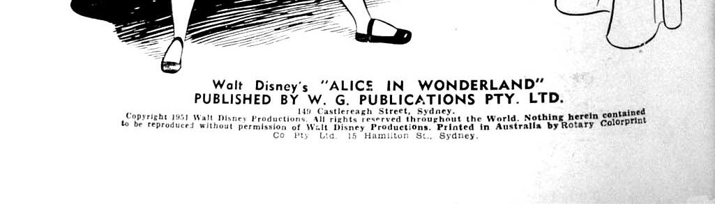 Walt Disney's "Alice in Wonderland" Published by W.G. Publications Pty. Ltd. 149 Castlereagh Street, Sydney. Copyright 1951. Walt Disney Productions. All rights reserved. Nothing herin contained to be reproduced without permission of Walt Disney Productions. Printed in Australia by Rotary Colorprint Co. Pty. Ltd., 15 Hamilton St., Sydney.