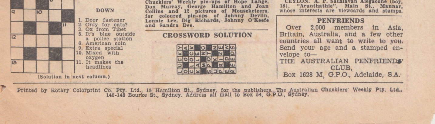 Printed by Rotary Colorprint Co. Pty. Ltd., 15 Hamilton St., Sydney, for the publishers, The Australian Chucklers' Weekly Pty. Ltd., 146-148 Bourke St., Sydney. Address all mail to Box 54, G.P.O., Sydney.