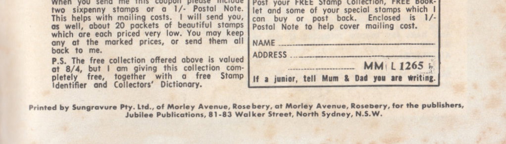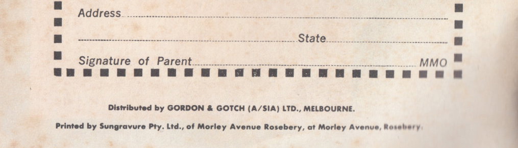 Distributed by Gordon & Gotch (A/sia) Ltd., Melbourne. Printed by Sungravure Pty. Ltd., of Moreley Avenue Rosebery, at Moreley Avenue, Rosebery, for the publishers, Jubilee Publications, 81-83 Walker Street, North Sydney, N.S.W.