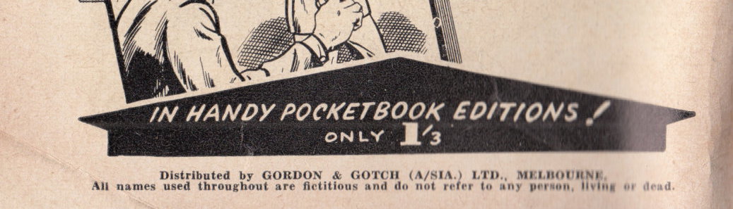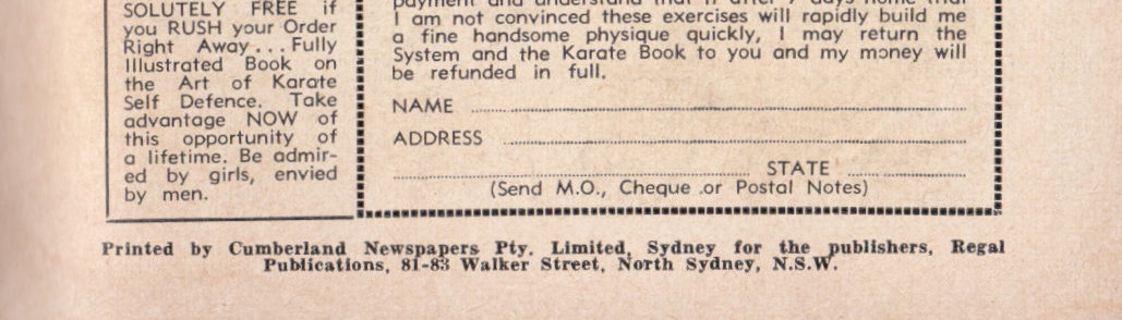 Printed by Cumberland Newspapers Pty. Limited, Sydney for the publishers, Regal Publications, 81-83 Walker Street, North Sydney, N.S.W. Distributed by Gordon & Gotch (A/sia) Ltd., Melbourne. All names used throughout are fictitious and do not refer to any person, living or dead.
