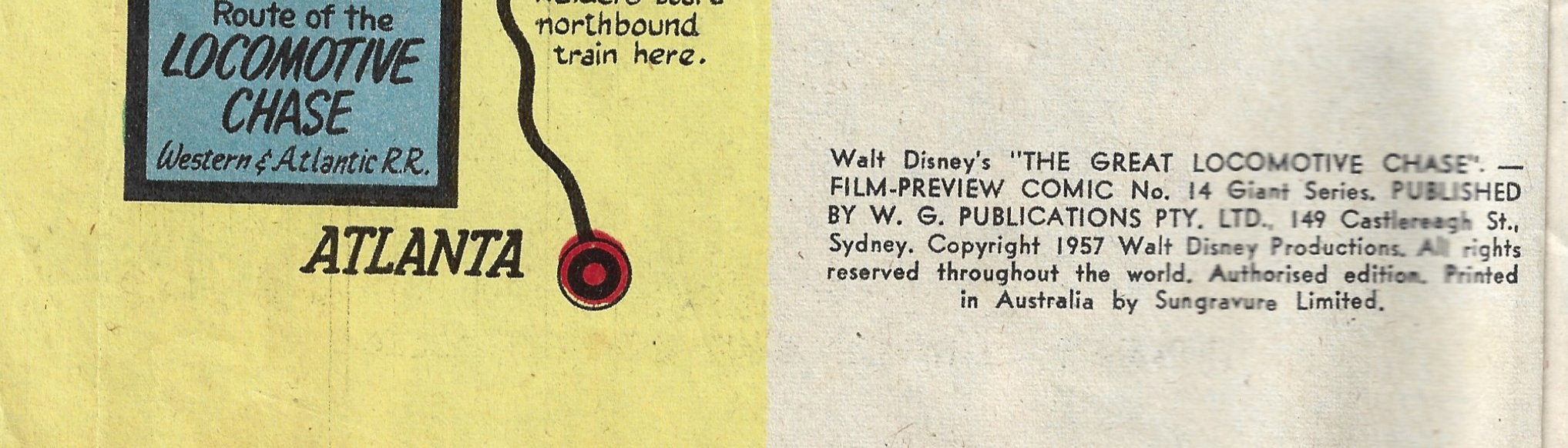 Walt Disney's "The Great Locomotive Chase".--Film-Preview Comic No. 14 Giant Series. Published by W. G. Publications Pty. Ltd., 149 Castlereagh St., Sydney. Copyright 1957 Walt Disney Productions. All rights reserved throughout the world. Authorised edition. Printed in Australia by Sungravure Limited.