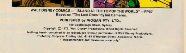 Walt Disney Comics -- "Island at the Top of the World" -- FP87. Based on "the Lost Ones" by Ian Cameron. Published by Wogan Pty. Ltd., 149 Castlereagh Street, Sydney. Copyright © 1976. Walt Disney Productions. World Rights Reserved. Printed by Conpress Printing Ltd., 61-63 O'Riordan Street, Alexandria, N.S.W.