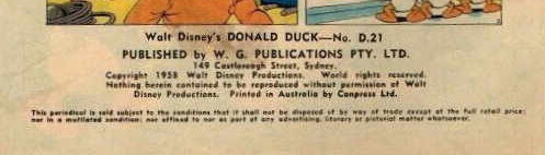 Walt Disney's Donald Duck—No. D.21 Published by W. G. Publications Pty. Ltd. 149 Castlereagh Street, Sydney. Copyright 1958 Walt disney Productions. World rights reserved. Nothing herein contained to be reproduced without permission of Walt Disney Productions. Printed in Australia by Conpress Ltd.