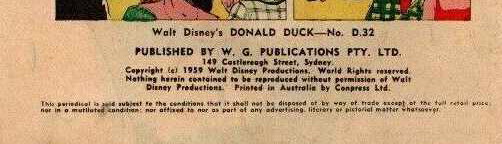 Walt Disney's Donald Duck--No. D.32. Published by W. G. Publications Pty. Ltd. 149 Castlereagh Street, Sydney. Copyright © 1959 Walt Disney Productions. World Rights reserved. Nothing herin contained to be reproduced without permission of Walt Disney Productions. Printed in Australia by Conpress Ltd.
