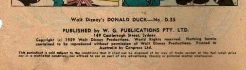Walt Disney's Donald Duck--No. D.35. Published by W. G. Publications Pty. Ltd. 149 Castlereagh Street, Sydney. Copyright © 1959 Walt Disney Productions. World Rights reserved. Nothing herin contained to be reproduced without permission of Walt Disney Productions. Printed in Australia by Conpress Ltd.