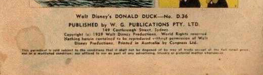 Walt Disney's Donald Duck--No. D.36. Published by W. G. Publications Pty. Ltd. 149 Castlereagh Street, Sydney. Copyright © 1959 Walt Disney Productions. World Rights reserved. Nothing herin contained to be reproduced without permission of Walt Disney Productions. Printed in Australia by Conpress Ltd.