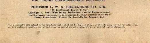 Walt Disney Comics--Donald Duck--D.51. Published by W. G. Publications Pty. Ltd. 149 Castlereagh Street, Sydney. Copyright © 1961 Walt Disney Productions. World Rights Reserved. Nothing herin contained to be reproduced withouth permission of Walt Disney Productions. Printed in Australia by Conpress Ltd.