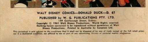 Walt Disney Comics--Donald Duck--D. 61. Published by W. G. Publications Pty. Ltd. 149 Castlereagh Street, Sydney. Copyright © 1961 Walt Disney Productions. World Rights reserved. Nothing herin contained to be reproduced without permission of Walt Disney Productions. Printed in Australia by Conpress Ltd.
