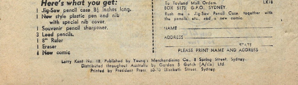 Larry Kent No. 18. Published by Young's Merchandising Co., 8 Spring Street, Sydney. Distributed throughout Australia by Gordon & Gotch (A/sia) Ltd. Printed by President Press, 60-70 Elizabeth Street, Sydney.