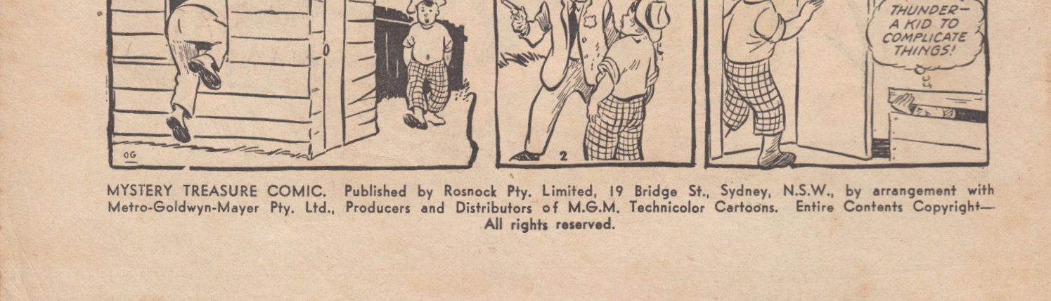 Mystery Treasure Comic. Published by Rosnock Pty. Limited, 19 Bridge St., Sydney, N.S.W., by arrangement with Metro-Goldwyn-Mayer Pty. Ltd., Producers and Distributors of M.G.M. Technicolor Cartoons. Entire Contents Copyright--All rights reserved. Drawn and printed in Australia by Jayar Studios. Associated Newspapers Ltd. And Seaborn Printing Co.