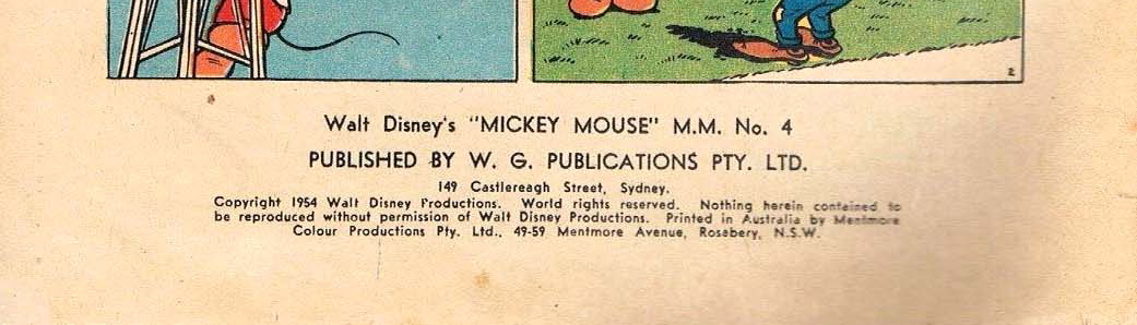 Wlat Disney's "Mickey Mouse" M.M. No. 4. Published by W. G. Publications Pty. Ltd. 149 Castlereagh Street, Sydney. Copyright 1954 Walt Disney Productions. World rights reserved. Nothing herin contained to be reproduced without permission of Walt Disney Productions. Printed in Australia by Mengtmore Colour Productions Pty. Ltd., 49-59 Mentmore Avenue, Rosebery, N.S.W.