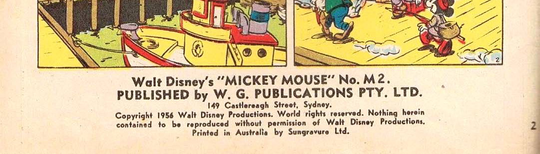 Walt Disney's "Mickey Mouse" No. M2. Published by W. G. Publications Pty. Ltd. 149 Castlereagh Street, Sydney. Copyright 1956 Walt Disney Productions. World rights reserved. Nothing herin contained to be reproduced without permission of Walt Disney Productions. Printed in Australia by Sungravure Ltd.
