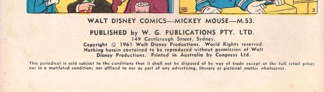 Walt Disney Comics -- Mickey Mouse -- M.53. Published by W. G. Publications Pty. Ltd. 149 Castlereagh Street, Sydney. Copyright © 1961 Walt Disney Productions. World rights reserved. Nothing herin contained to be reproduced without permission of Walt Disney Productions. Printed in Australia by Conpress Ltd.