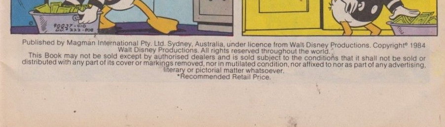 Published by Magman International Pty. Ltd. Sydney, Australia, under licence from Walt Disney Productions. Copyright 1984 Walt Disney Productions. All rights reserved throughout the world. This book may not be sold except by authorised dealers and is sold subject to the conditions that it shal not be sold or distributed with any part of its cover or markings removed, nor in mutilated condition, nor affixed to nor as part of any advertising, litery or pictorial matter whatsoever.