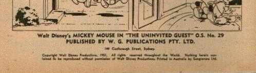 Walt Disney's Mickey Mouse in "The Uninvited Guest" O.S. No. 29. Published by W. G. Publications Pty. Ltd. 149 Castlereagh Street, Sydney. Copyright Walt Disney Productions 1951. All rights reserved throughout the world. Nothing herin contained to be reproduced without permission of Walt Disney Productions. Printed in Australia by Sungravure Ltd.