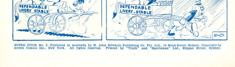 Super Duck No. 2: Published in Australia by H. John Edwards Publishing Co. Pty. Ltd., 14 Bond Street, Sydney. Copyright by Archie Comics Inc. New York. All rights reserved. Printed by "Truth" and "Sportsman" Ltd., Kippax Street, Sydney.