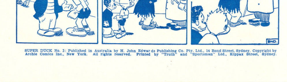 Super Duck No. 3: Published in Australia by H. John Edwards Publishing Co. Pty. Ltd., 14 Bond Street, Sydney. Copyright by Archie Comics Inc., New York. All rights reserved. Printed by "Truth" and "Sportsman" Ltd., Kippax Street, Sydney.