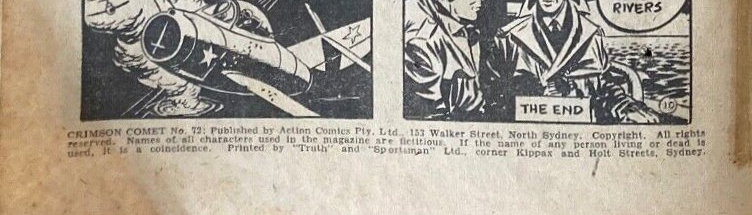 Chrimson Comet No. 72: Published by Action Comics Pty. Ltd., 153 Walker Street, North Sydney. Copyright. All rights reserved. Names of all characters used in the magazine are fictitious. If the name of any person living or dead is used, it is a coincidence. Printed by "Truth" and "Sportsman" Ltd., corner Kippax and Holt Streets, Sydney.
