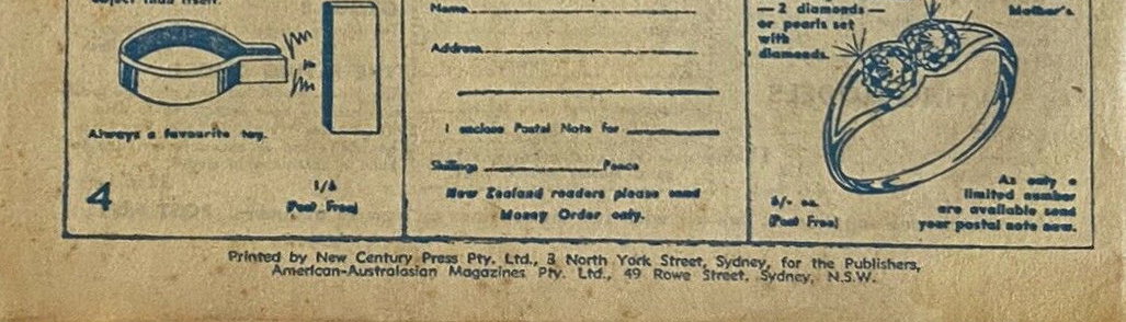 Printed by New Century Press Pty. Ltd., 3 North York Street, Sydney, for the Publishers American-Australasian Magazines Pty. Ltd., 49 Rowe Street, Sydney, N.S.W.
