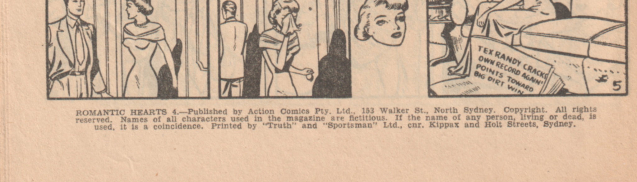 Romantic Hearts 4.—Published by Action Comics Pty. Ltd., 153 Walker St., North Sydney. Copyright. All rights reserved. Names of all characters used in the magazine are fictitious. If the name of any person, living or dead, is used, it is a coincidence. Printed by "Truth" and "Sportsman" Ltd., cnr. Kippax and Holt Streets, Sydney.
