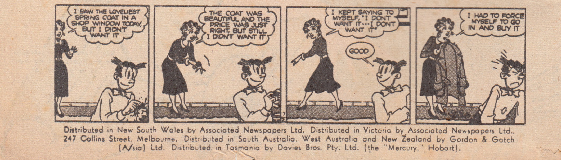 Distributed in New South Wales by Associated Newspapers Ltd. Distributed in Victoria by Associated Newspapers Ltd., 247 Collins Street, Melbourne. Distributed in South Australia, West Australia and New Zealand by Gordon & Gotch (A/sia) Ltd. Distributed in Tasmania by Davies Bros. Pty. Ltd. (the "Mercury,") Hobart). Published by Associated Newspapers Ltd., 60-70 Elizabeth street, Sydney. Printed by Sungravure Ltd., Sydney. Copyright. All rights reserved.