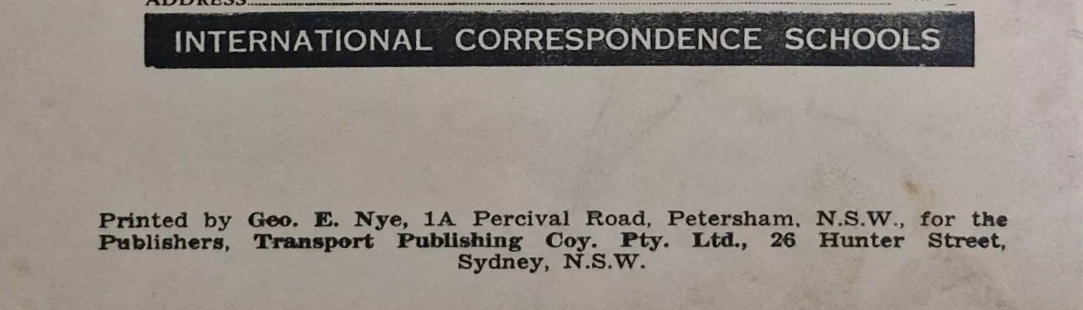 Printed by Geo. E. Nye, 1A Percival Road, Petersham, N.S.W., for the Publishers, Transport Publishing Coy. Pty. Ltd., 26 Hunter Street, Sydney, N.S.W.