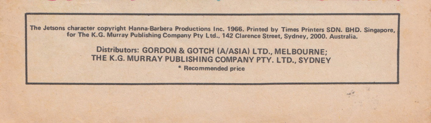 The Jetsons character copyright Hanna-Barbera Productions Inc. 1966. Printed by Times Printers SDN BHD, Singapore, for The K.G. Murray Publishing Company Pty Ltd, 142 Clarence Street, Sydney, 2000, Australia. Distributors: Gordon & Gotch (A/Asia) Ltd., Melbourne; The K.G.Murray Publishing Company Pty. Ltd., Sydney.