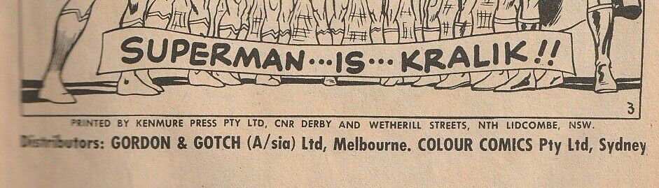 Printed by Kenmure Press Pty Ltd, cnr Derby and Wetherill Streets Nth Lidcombe, NSW, for the Proprietors Colour Comics Pty Ltd, Sydney, and produced by The K. G. Murray Publishing Company Pty Ltd, 142 Clarence Street, Sydney. Gordon & Gotch (A/sia) Ltd, distributors for Australia and New Zealand. Sequences in this issue Copyright National Periodical Publications Inc.