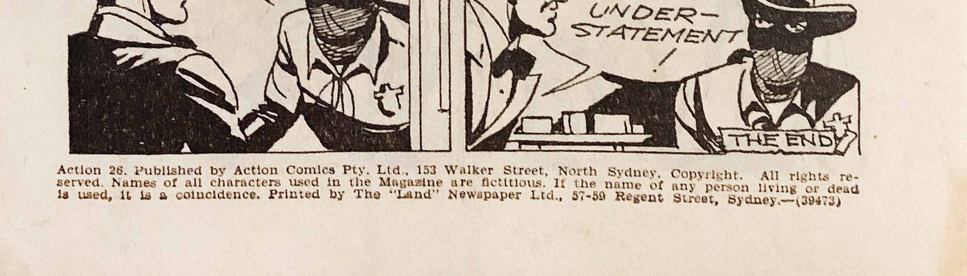 Action 26. Published by Action Comics Pty. Ltd., 153 Walker Street, North Sydney, Copyright. All rights reserved. Names of all characters used in the Magazine are fictitious. If the name of any person living or dead is used it is a coincidence. Printed by The "Land" Newspaper Ltd., 57-59 Regent Street, Sydney.--(39473)