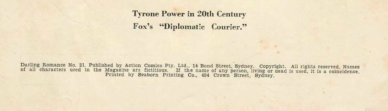 Darling Love No. 20: Published by Action Comics Pty. Ltd., 14 Bond Street, Sydney. Copyright. All rights reserved. Names of all characters used in the magazine are fictitious. If the name of any person, living or dead, is used, it is a coincidenc. Printed by "Trut" and "Sportsman" Ltd., corner Kippax and Holt Streets, Sydney.