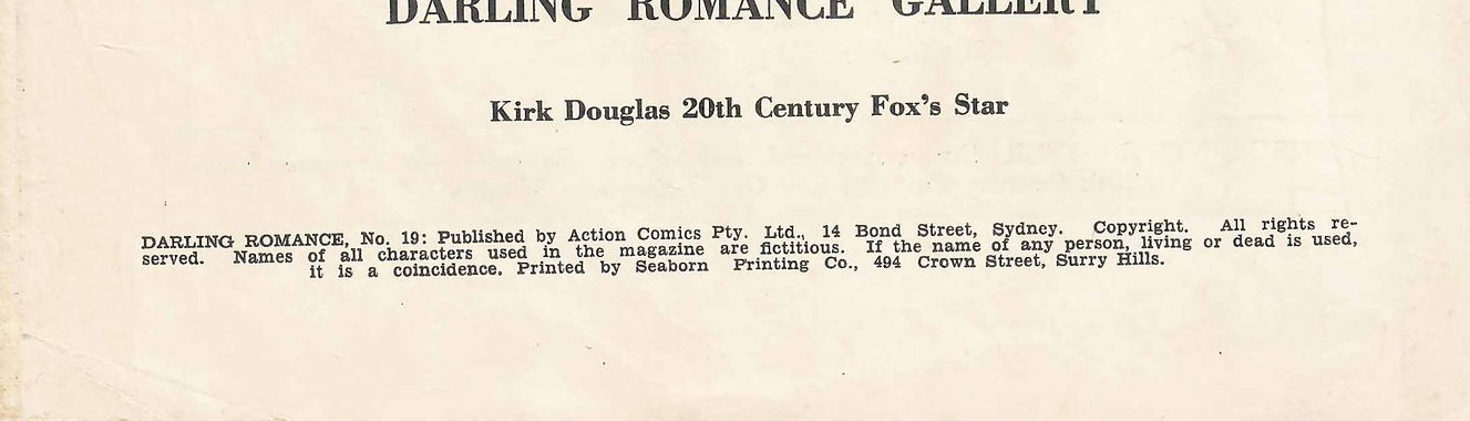 Darling Romance No. 19: Published by Action Comics Pty. Ltd., 14 Bond Street, Sydney. Copyright. All rights reserved. Names of all characters used in the magazine are fictitious. If the name of any person, living or dead is used, it is a coincidence. Printed by Seaborn Printing Co., 494 Crown Street, Surry Hills.