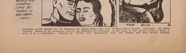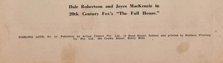 Darling Love Comics No. 19: Published by Action Comics Pty Ltd., 14 Bond Street, Sydney. Copyright. All rights reserved. Names of all characters used in the Magazine are fictitious. If the name of any person, living or dead, is used, it is a coincidence. Printed by "Trugh" and "Sportsman" Ltd., cnr. Kippax and Holt Streets, Sydney.