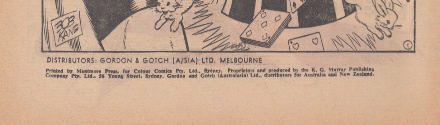 Printed by Mentmore Press, for Colour Comics Pty. Ltd., Sydney, proprietors and produced by the K. G. Murray Publishing Company Pty. Ltd., 56 Young Street, Sydney. Gordon and Gotch (Australasia) Ltd., distributors for Australia and New Zealand.