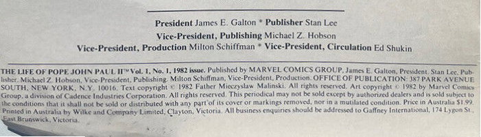 Published by Marvel Comics Group ... Printed in Australia by Wilke and Company Limited, Clayton, Victoria. All business enquiries should be addressed to Gaffney International, 174 Lygon St., East Brunswick, Australia.