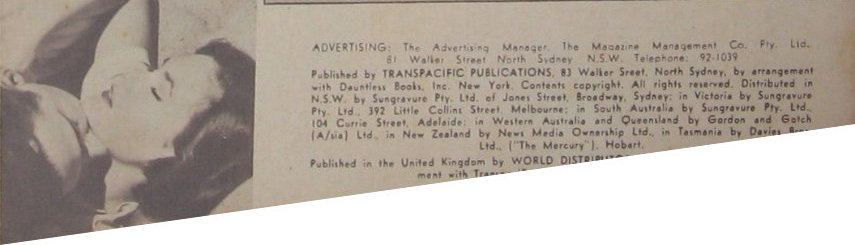 Advertising: The Advertising Manager, The Magazine Management Co. Pty. Ltd. 81 Walker Street, North Sydney, N.S.W. Telephone 92-1039. Published by Transpacific Publications, 83 Walker Street, North Sydney, by arrangement with Dauntless Books, Inc. New York…