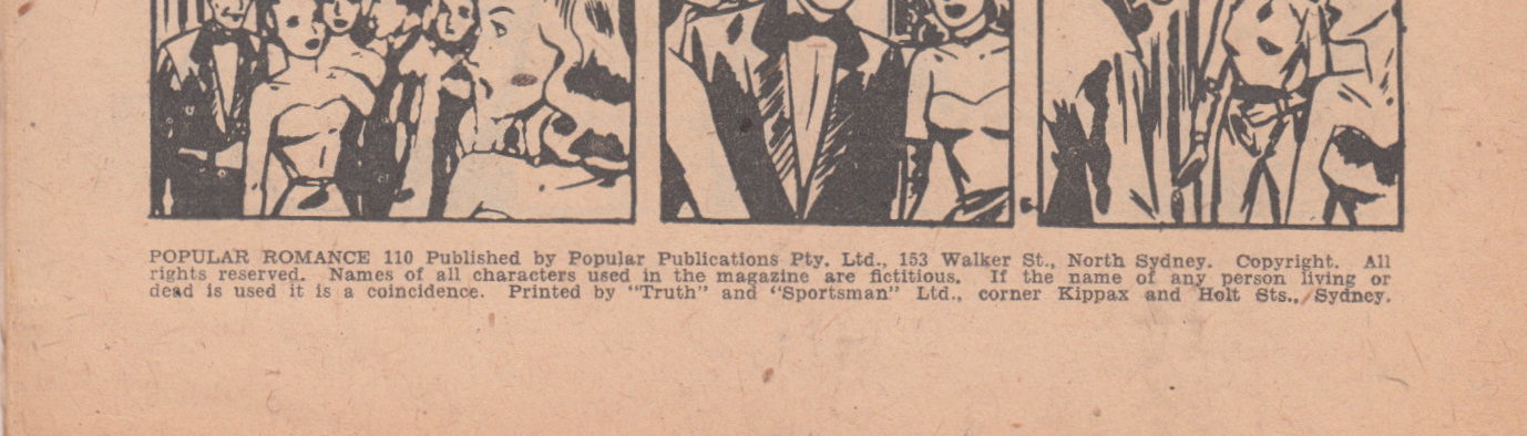 Popular romance 110 Published by Popular Publications Pty. Ltd., 153 Walker St., North Sydney. Copyright. All rights reserved. Names of all characters used in the magazine are fictitious. If the name of any person Living or dead is used it is a coincidence. Printed by "Trugh" and "Sportsman" Ltd., corner Kippax and Holt Sts., Sydney.
