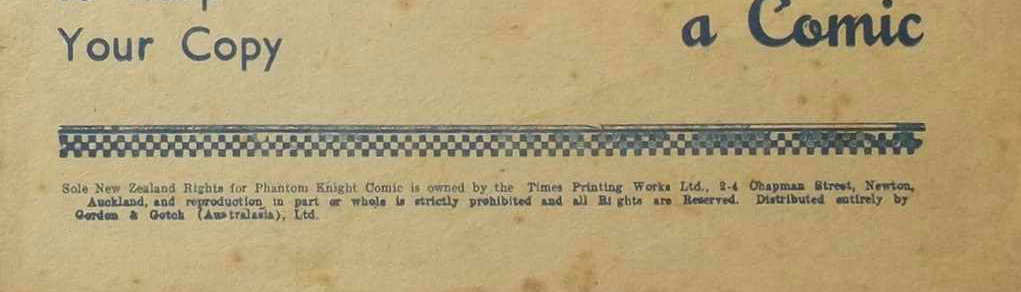 Sole New Zealand rights for Phantom Knight Comic is owned by the Times Printing Works Ltd., 2-4 Chapman Street, Newton, Auckland, and reporduction in part or whole is strictly prohibited and all rights are reserved. Distributed entirely by Gordon & Gotch (Australasia), Ltd.