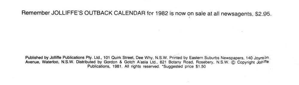 Published by Jolliffe Publications Pty. Ltd., 101 Quirk Street, Dee Why, N.S.W. Printed by Eastern Suburbs Newspapers, 140 Joynton Avenue, Waterloo, N.S.W. Distributed by Gordon & Gotch A'asia Ltd., 821 Botany Road, Rosebery N.S.W. © Copyright Jolliffe Publications, 1981. All rights reserved.