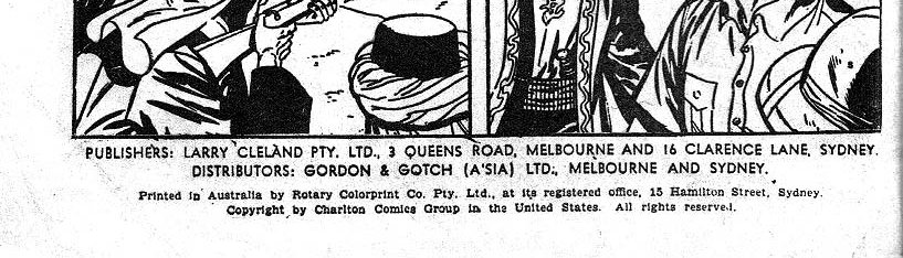 Publishers: Larry Cleland Pty. Lotd., 3 Queens Road, Melbourne and 16 Clarence Lane, Sydney. Distributors: Gordon & Gotch (A'sia) Ltd., Melbourne and Sydney. Printed in Australia by Rotary Colorprint Co. Pty. Ltd., at its registered office, 15 Hamilton Street, Sydney. Copyright by Charlton Comics Group in the United States. All rights reserved.