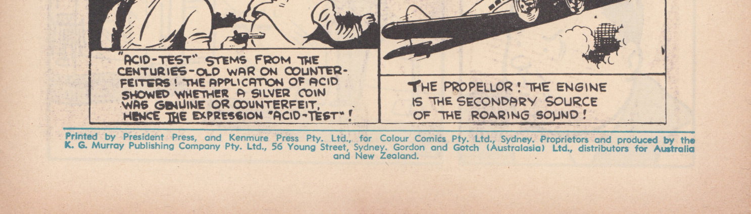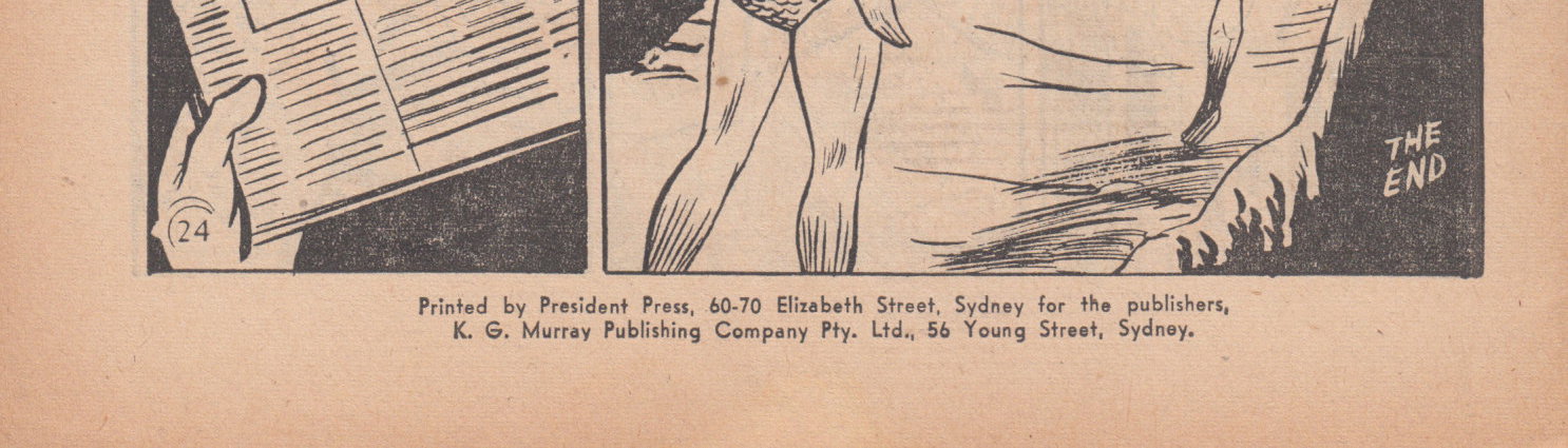 [On interior:] Printed by President Press, 60-70 Elizabeth Street, Sydney for the publishers, K. G. Murray Publishing Company Pty. Ltd., 56 Young Street, Sydney. [On cover:] Printed by President Press, and Kenmure Press Pty. Ltd., for Colour Comics Pty. Ltd., Sydney, Proprietors and produced by the K. G. Murray Publishing Company Pty. Ltd., 56 Young Street, Sydney. Gordon and Gotch (Australasia) Ltd., distributors for Australia and New Zealand.