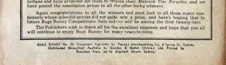 Bugs Bunny No. 20. Copyright. Published by Young's Merchandising Co., 8 Sprint St., Sydney. Distributed throughout Australia by Gordon & Gotch (A/sia) Ltd. Printed by President Press, 60-70 Elizabeth Street, Sydney.