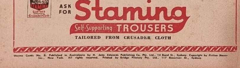 Sheena Comic No. 8: Published in Australasia by H. John Edwards Publishing Co. Pty. Ltd., 14 Bond St., Sydney. Copyright by Fiction House Inc., New York. All rights reserved. Printed by Bridge Printery Pty. Ltd., 117 Reservoir St., Sydney.