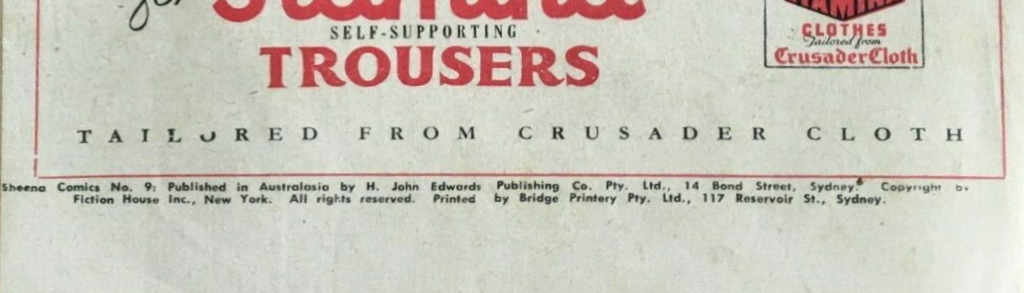 Sheena Comics No. 9: Published in Australasia by H. John Edwards Publishing Co. Pty. Ltd., 14 Bond Street, Sydney. Copyright by Fiction House Inc., New York. All rights reserved. Printed by Bridge Printery Pty. Ltd., 117 Reservoir St., Sydney.