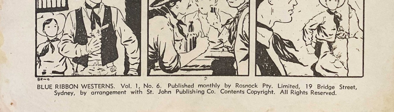 Blue Ribbon Westerns. Vol. 1, No. 6. Published monthly by Rosnock Pty. Limited, 19 Bridge Street, Sydney, by arrangement with St. John Publishing Co. Contents Copyright. All rights reserved. Drawn and printed in Australia by Jayar Studios. Associated Newspapers Ltd., and Seaborn Printing Co.